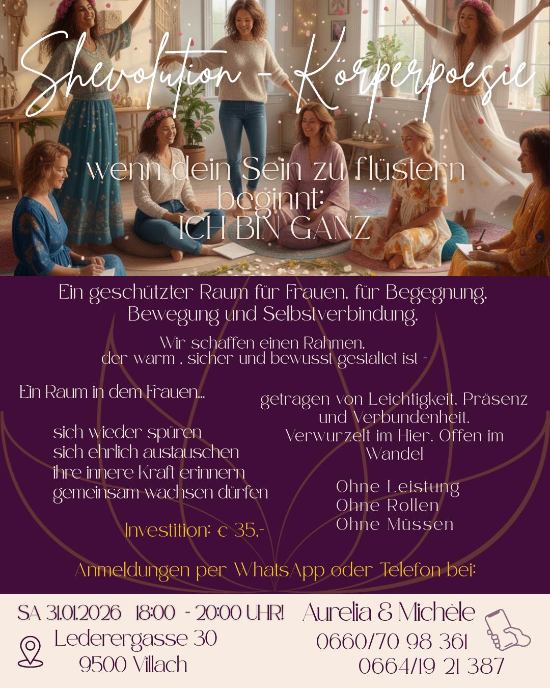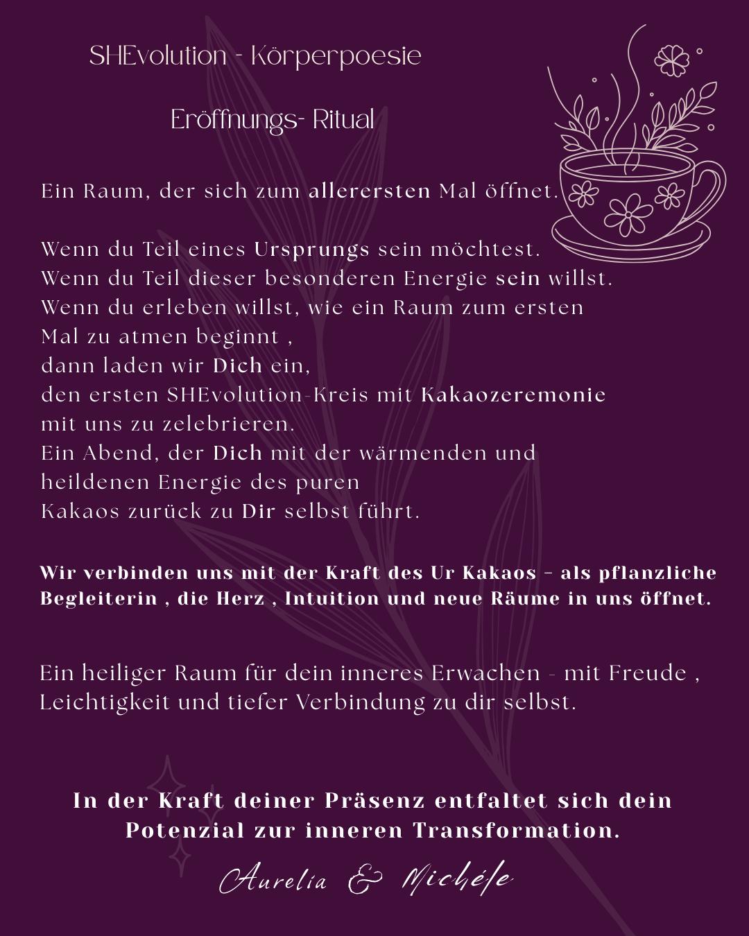 SHEvolution ist ein ritueller Frauenkreis für innere Wandlung, Körperpräsenz und Selbstermächtigung. Mit Kakao, Bewegung, Symbolen und Stille öffnen wir einen Raum für Verbindung, Herzöffnung und weibliche Kraft. Ein Kreis, der trägt. Ein Feuer, das nährt.
